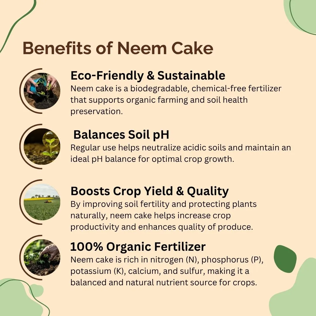 Neem cake is 100% biodegradable and chemical-free, helping restore soil fertility while reducing environmental pollution caused by synthetic fertilizers.