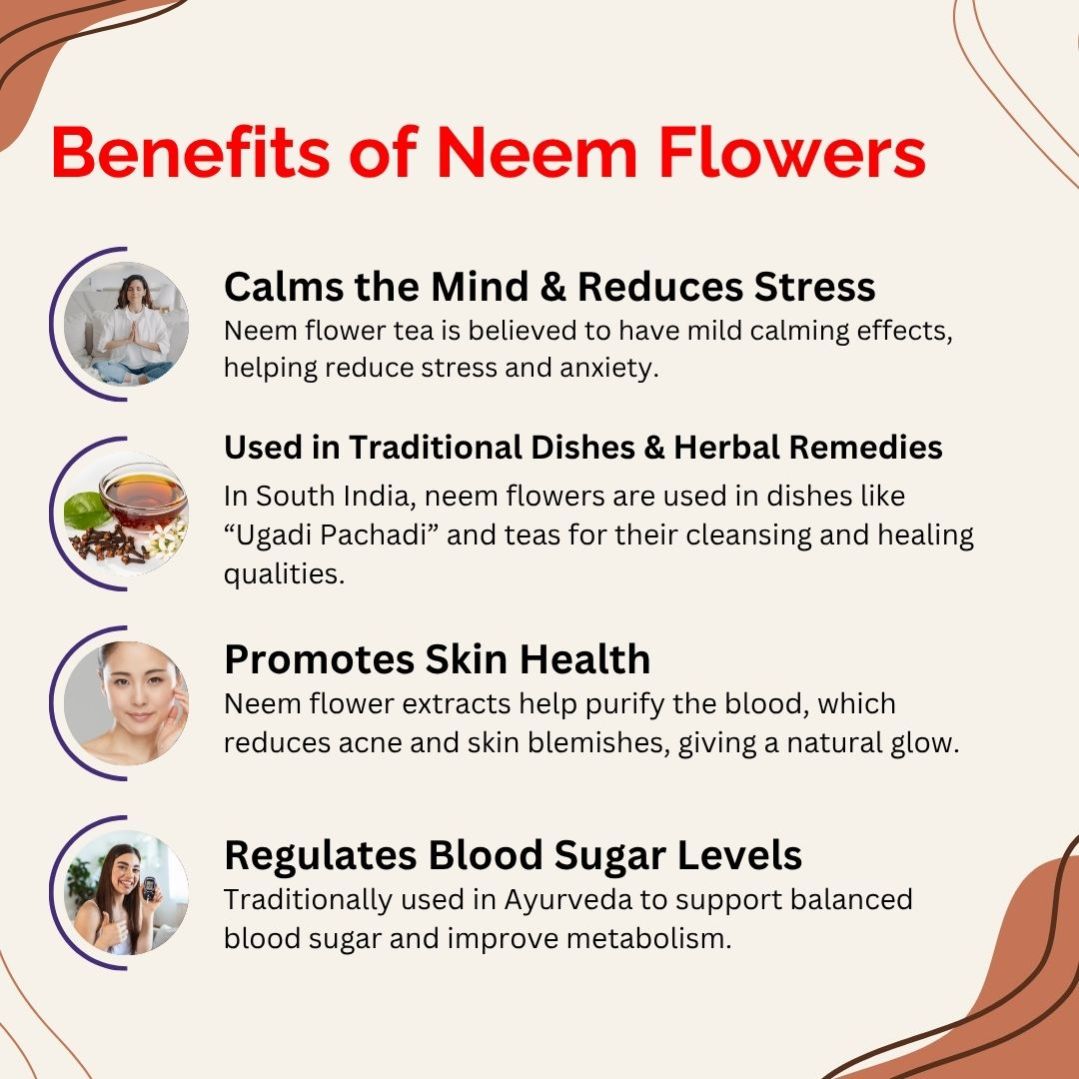 Neem flower tea is believed to have mild sedative and calming effects, helping reduce anxiety and improve focus.
