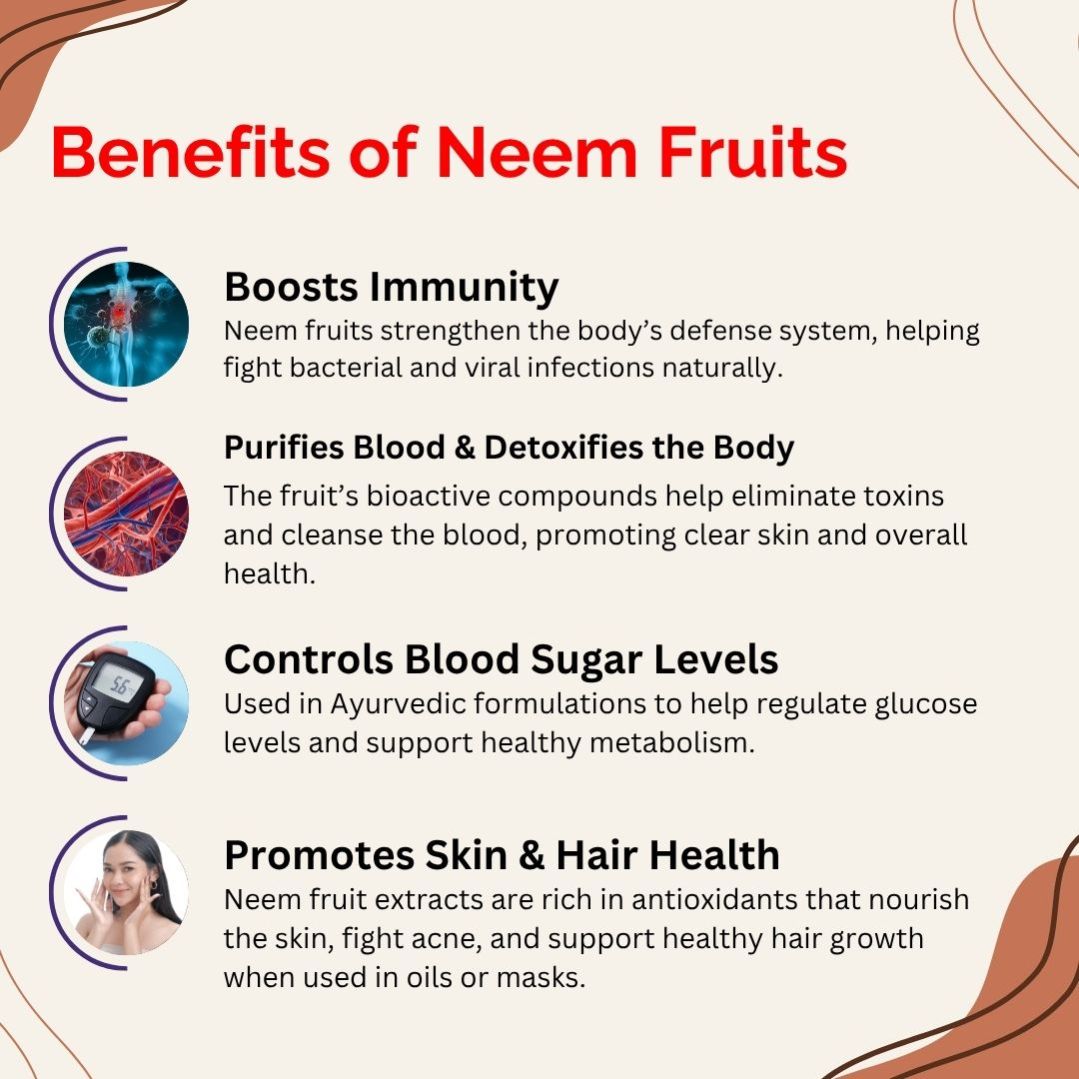 In Ayurveda, neem fruits are considered a natural detoxifier, promoting inner cleansing and supporting skin, hair, and overall health.