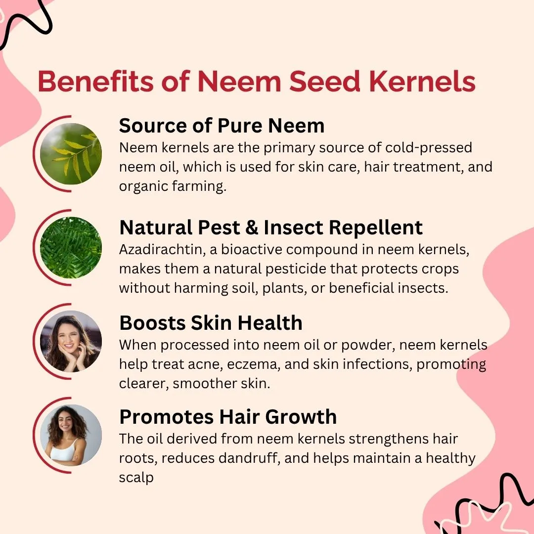 The main use of neem seed kernels is cold-pressing for neem oil, which is widely used in organic pest control and natural fertilizers.